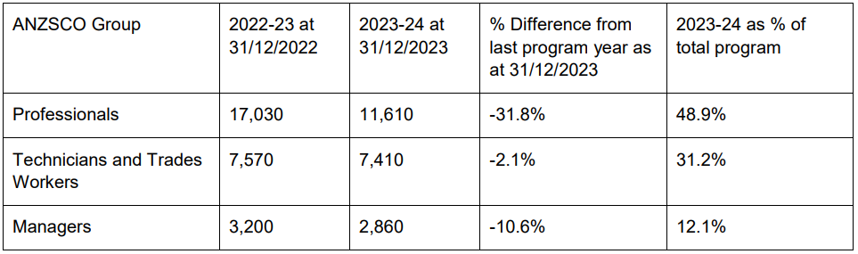 Out of the Top 3 ANZSCO Groups, Professionals (individuals who perform analytical, conceptual and creative tasks) saw the most significant decrease in Granted Applications (-31.8%). Technicians and Trades Workers (individuals who perform a variety of skilled tasks, often in support of scientific, engineering, building and manufacturing activities) were least impacted, reducing by only 2.1% from 2022 to 2023.